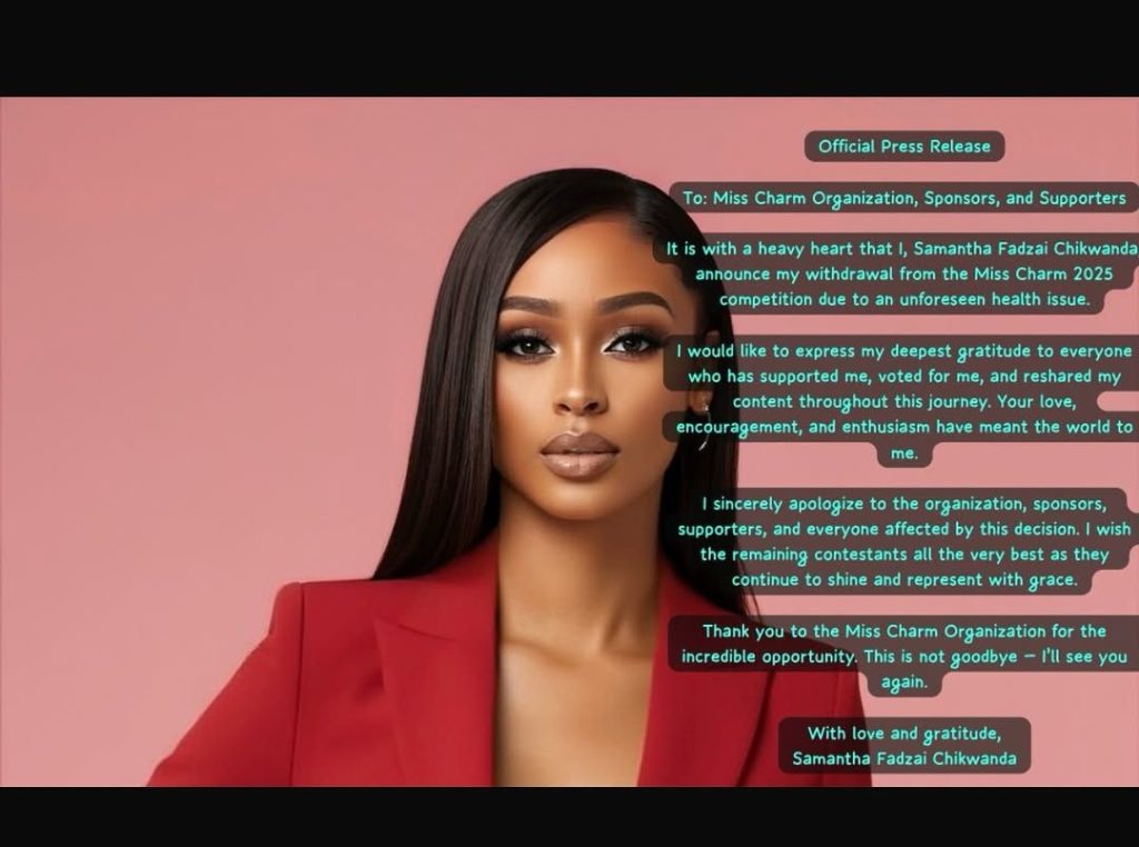 > “It is with a heavy heart that I, Samantha Fadzai Chikwanda, announce my withdrawal from the Miss Charm 2025 competition due to an unforeseen health issue,” she wrote.