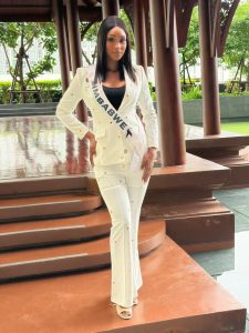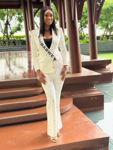 Miss Zimbabwe wowed in a chic white tailored suit, adorned with delicate gold embellishments. The look was crisp, elegant, and effortlessly commanding.