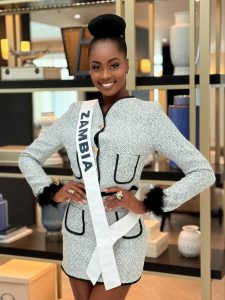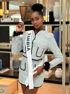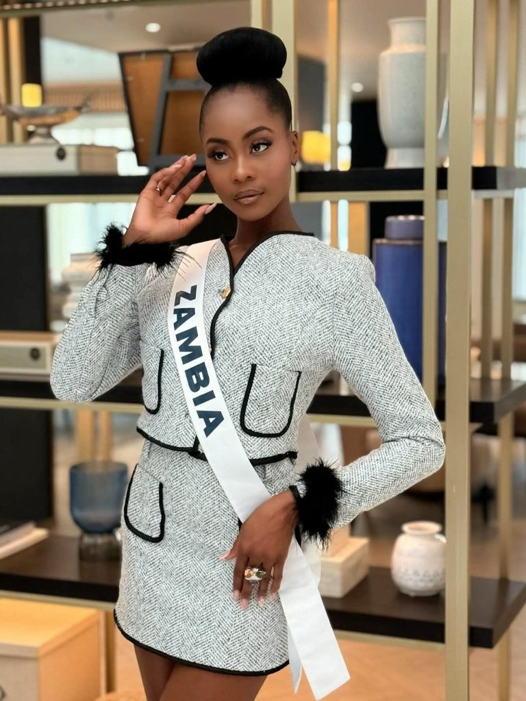 Miss Zambia delivered pure sophistication in a tailored tweed two-piece set, reminiscent of classic Parisian couture.