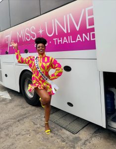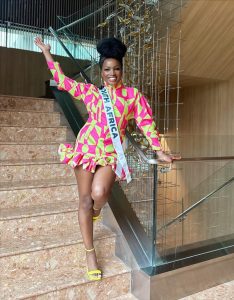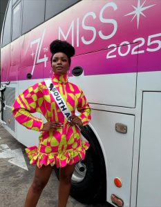 In a fashion moment that demands attention, Miss South Africa stepped out in a neon-fused African print mini-dress, bursting with personality.